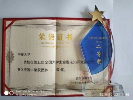 在10月20日结束的第五届全国大学生金融法知识竞赛(西北赛区)中,由法律系曹慈义老师担任教练,法学专业2016级7名同学组成的宁夏大学代表队获得第二名的好成绩。本次比赛由西北政法大学主办,参赛队包括兰州大学、西北大学等西北地区知名高校。