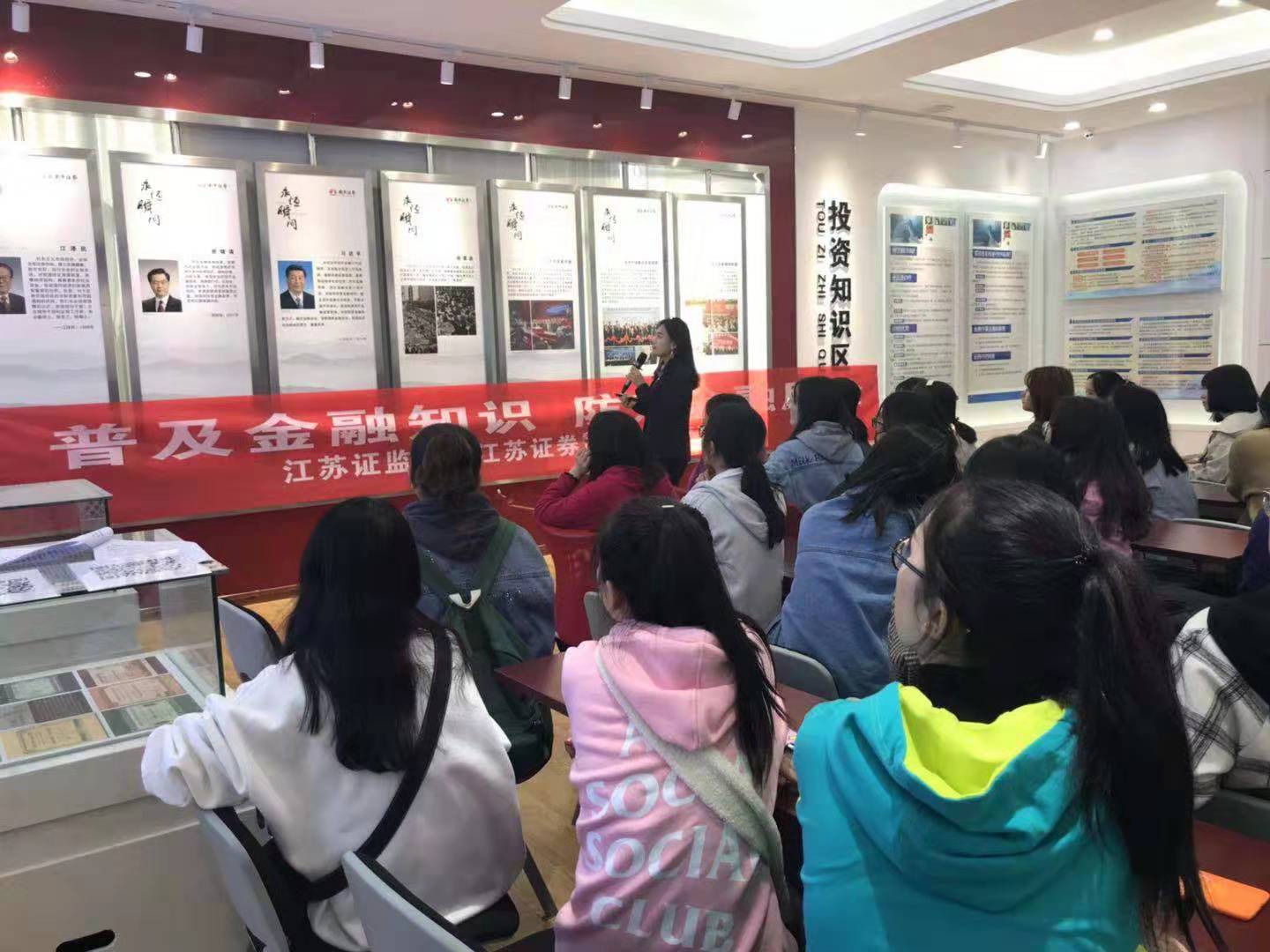 证券所现场教育活动主要分为四个环节,一是现场观摩教学。证券所李老师分别向同学们展示和讲解了所内的历史进展区、投资知识区以及风险防范区;二是证券专业知识讲授。证券所陈老师为同学们详细讲解了证券所的历史发展;三是有奖知识抢答。同学们运用课本相关理论知识和现场参观所学积极抢答,参与热情高昂,现场互动热烈;四是增强风险防范意识。李静主任从证券交易的家庭风险以及证券投资的个人风险两方面强化了学生们的风险意识。