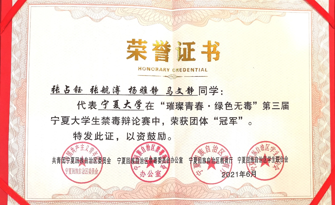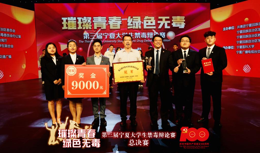 打赢禁毒战,青年勇担当。6月16日,在第34个“6·26”国际禁毒日即将到来之际,由共青团宁夏回族自治区委员会、宁夏回族自治区禁毒委员会办公室、宁夏回族自治区教育厅、宁夏回族自治区学生联合会主办的“璀璨青春绿色无毒”第三届全区大学生禁毒辩论赛总决赛暨颁奖典礼在宁夏广播电视总台举办,宁夏大学代表队再次蝉联冠军。