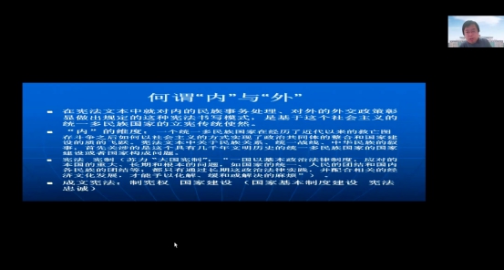 答疑环节,常安细致地回答了同学们提出的问题,并对“如何看待在少数民族自治地区实现市域治理现代化”、“市域治理和民族区域自治如何结合”等问题展开了深入的讲解。常安在回应的同时也提示同学们要从铸牢中华民族共同体意识的角度出发进行思考,并针对同学们用语准确性等方面提出了建议,进一步启发了在场师生对中国宪法文本领域深入钻研的积极性,尤其不能忽视对宪法序言的研究。