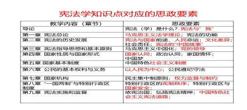 综上,《宪法学》课程思政教学不仅承载着知识的创新和专业素养的培育,还担负在意识形态领域价值塑造和培养德法兼备卓越法律人才的重要功能,还需充分发掘宪法学中的思想政治元素,通过宪法学课程与思政元素不同角度的结合,使宪法课程成为法学教育中德法兼修和专业育人的重要平台。