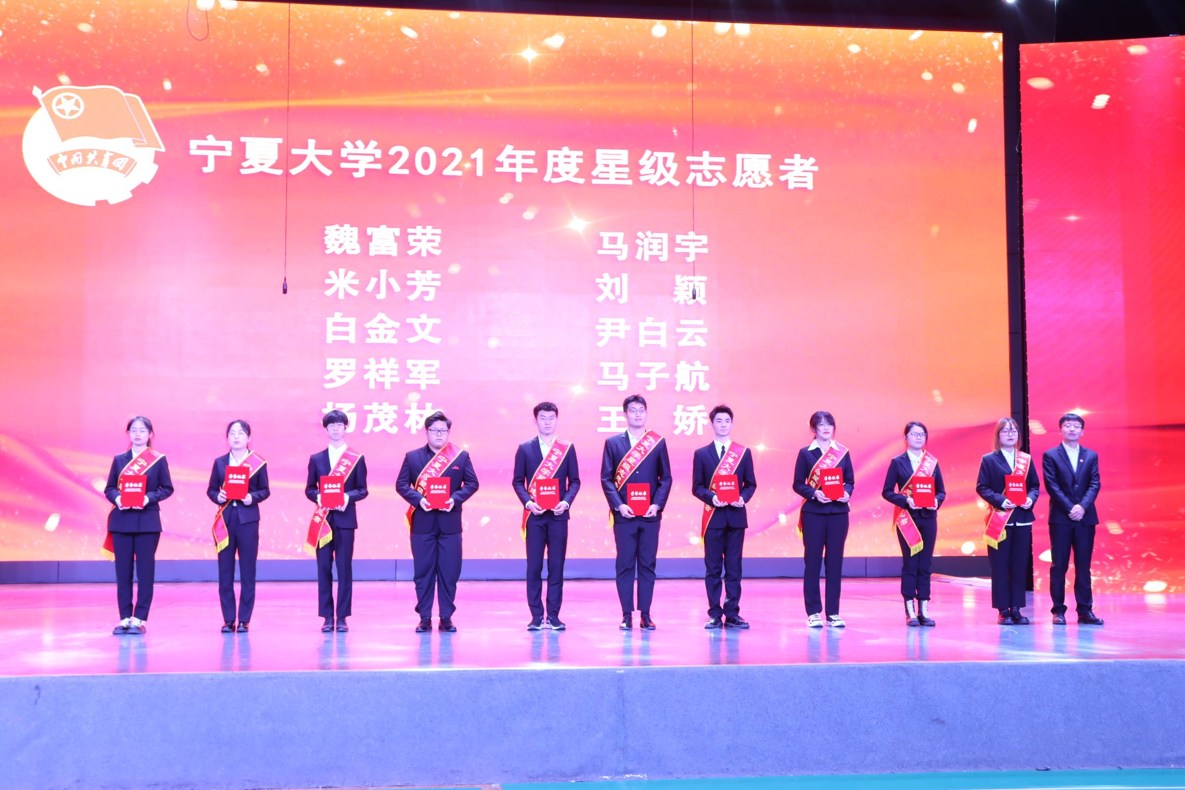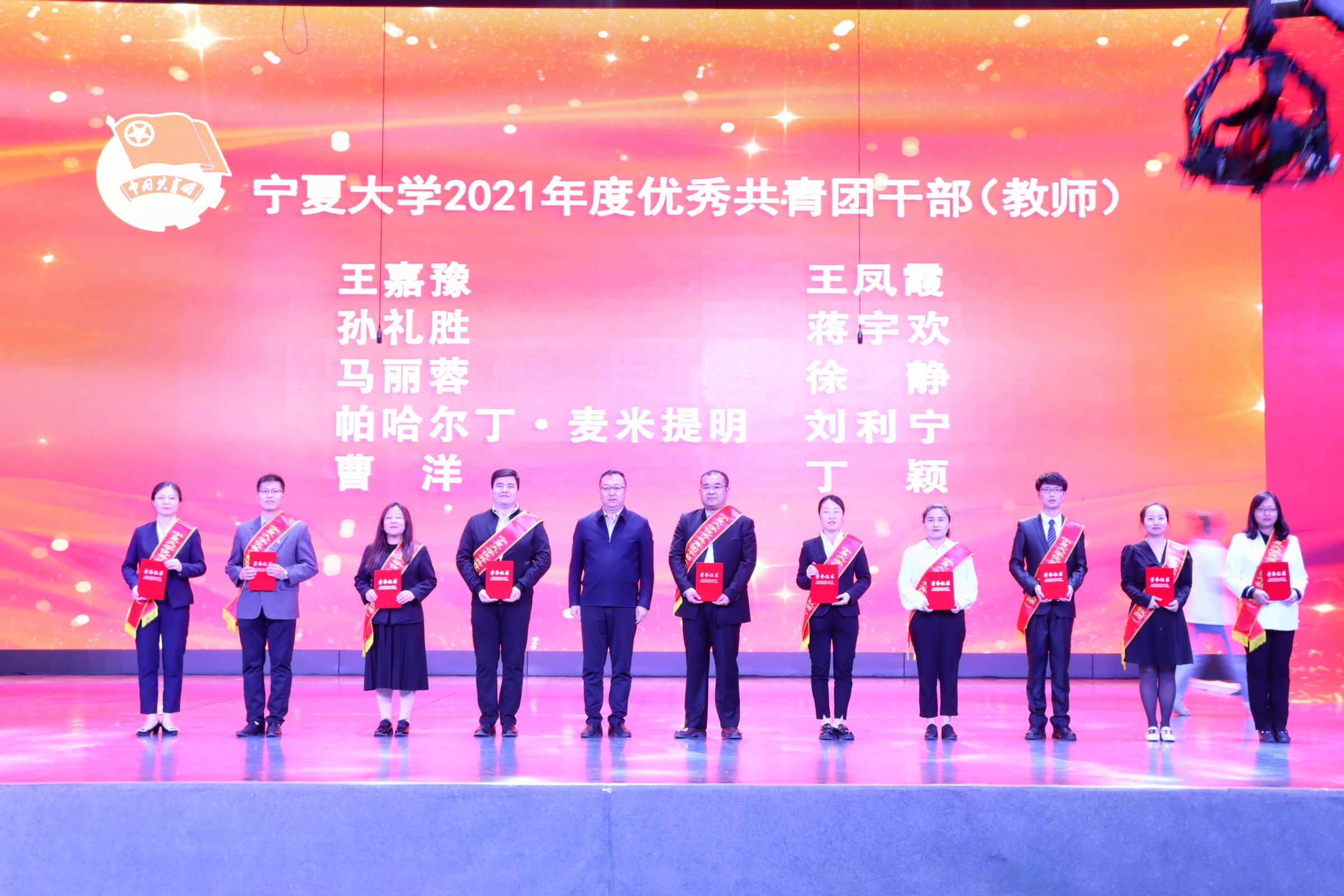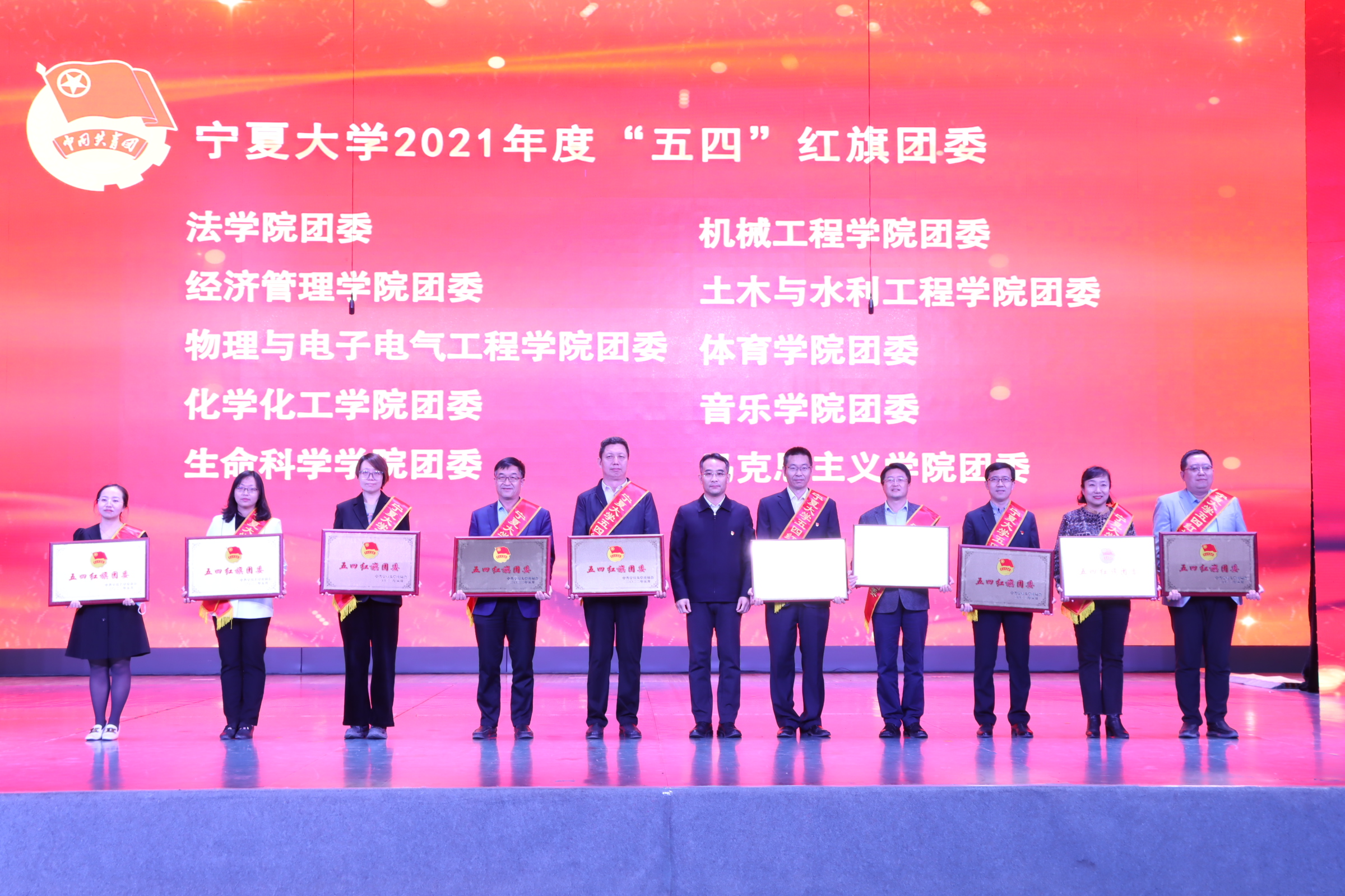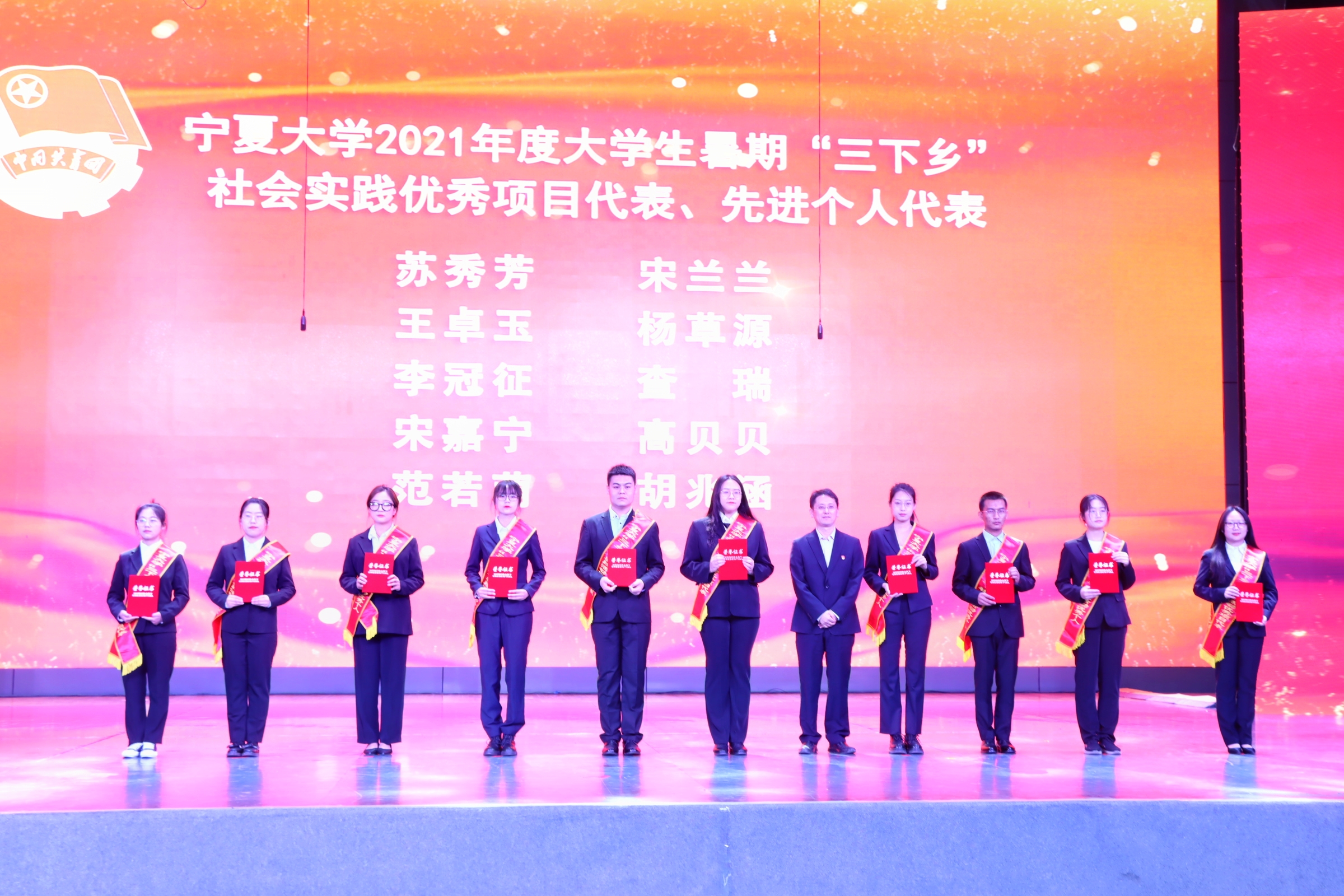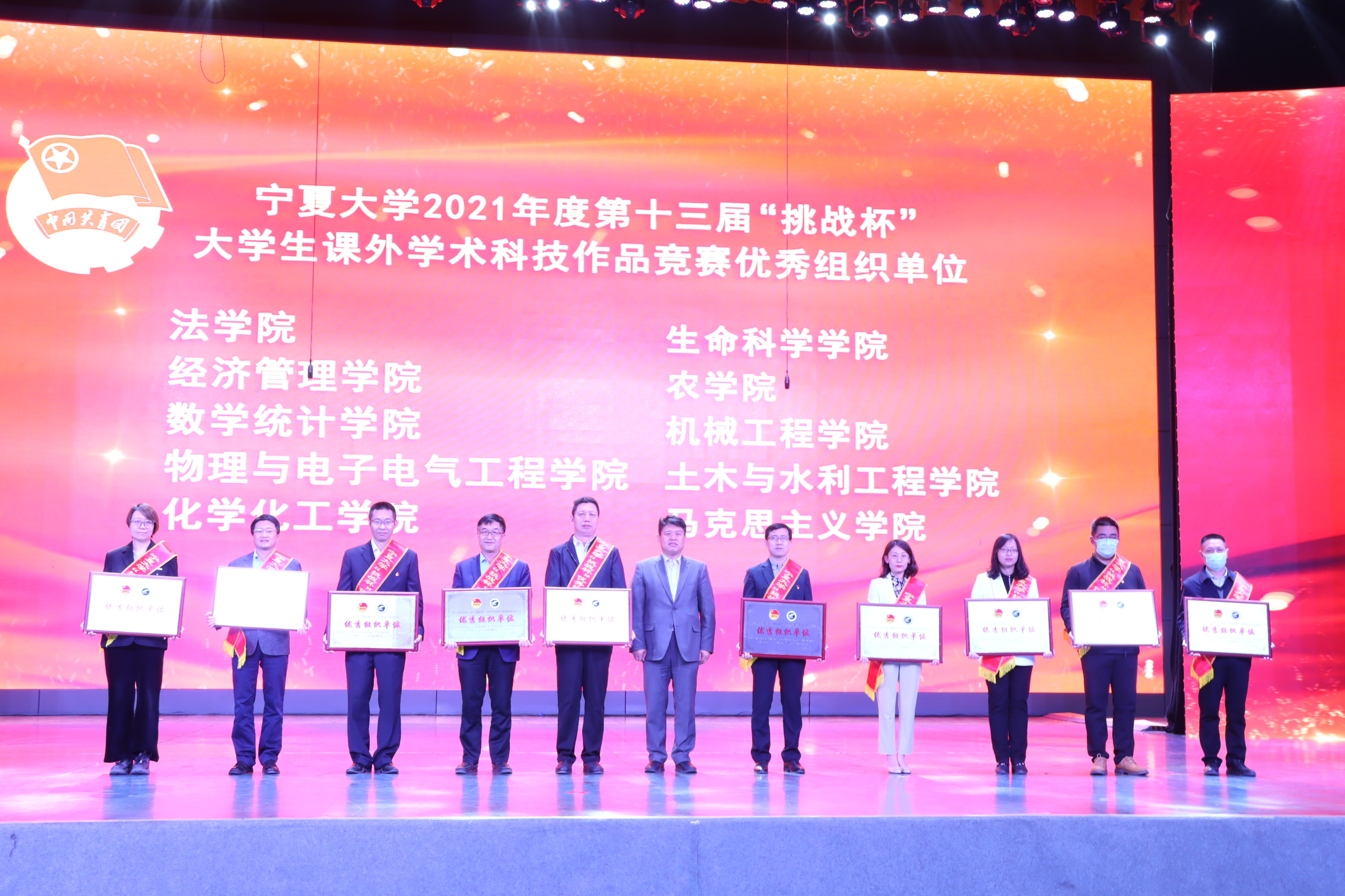 荣获宁夏大学2021年度第十三届“挑战杯”大学生课外学术科技作品竞赛优秀组织单位、大学生暑期“三下乡”社会实践优秀组织单位,杨草源荣获宁夏大学2021年度大学生暑期“三下乡”社会实践先进个人,魏富荣荣获宁夏大学2021年度星级志愿者称号,与会领导为他们颁发了奖牌和证书。