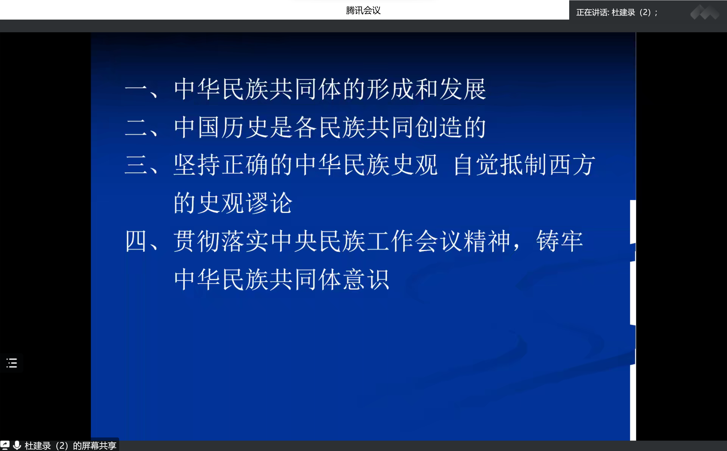 讲座中杜建录以时间为轴,讲述了从古至今中华民族共同体意识的形成与发展过程,以中国辽阔疆域、悠久历史、灿烂文化、伟大精神为例说明了中国历史是各民族共同创造的。