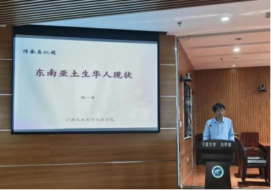 行政管理与社会学系、宁夏大学勤学书院于5月23日晚在文荟楼模拟法庭举办“传承与认同:东南亚土生华人研究”讲座。本次讲座特邀广西民族大学教授,博士生导师,广西侨乡文化研究中心主任郑一省主讲,由宁夏大学行政管理与社会学系系主任雷安琪副教授主持,行社系师生80余人参加此次讲座。