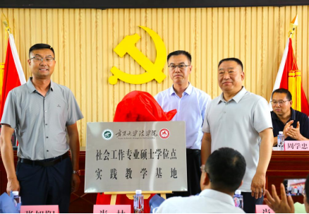 党总支书记李治涛、院长吕耀军与金凤区丰登镇润丰村党支部书记王鹏程共同为“宁夏大学社会工作专业硕士学位点实践教学基地”揭牌。