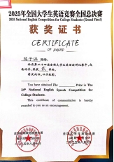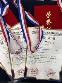 2023级行政管理1班梁一鸣和2023级法学1班陈子涵代表宁夏回族自治区参加全国总决赛。在第二十四届全国大学生英语演讲比赛中,两人分获优秀奖和二等奖;此外,梁一鸣代表宁夏斩获全国大学生英语辩论赛二等奖以及风采大赛二等奖。