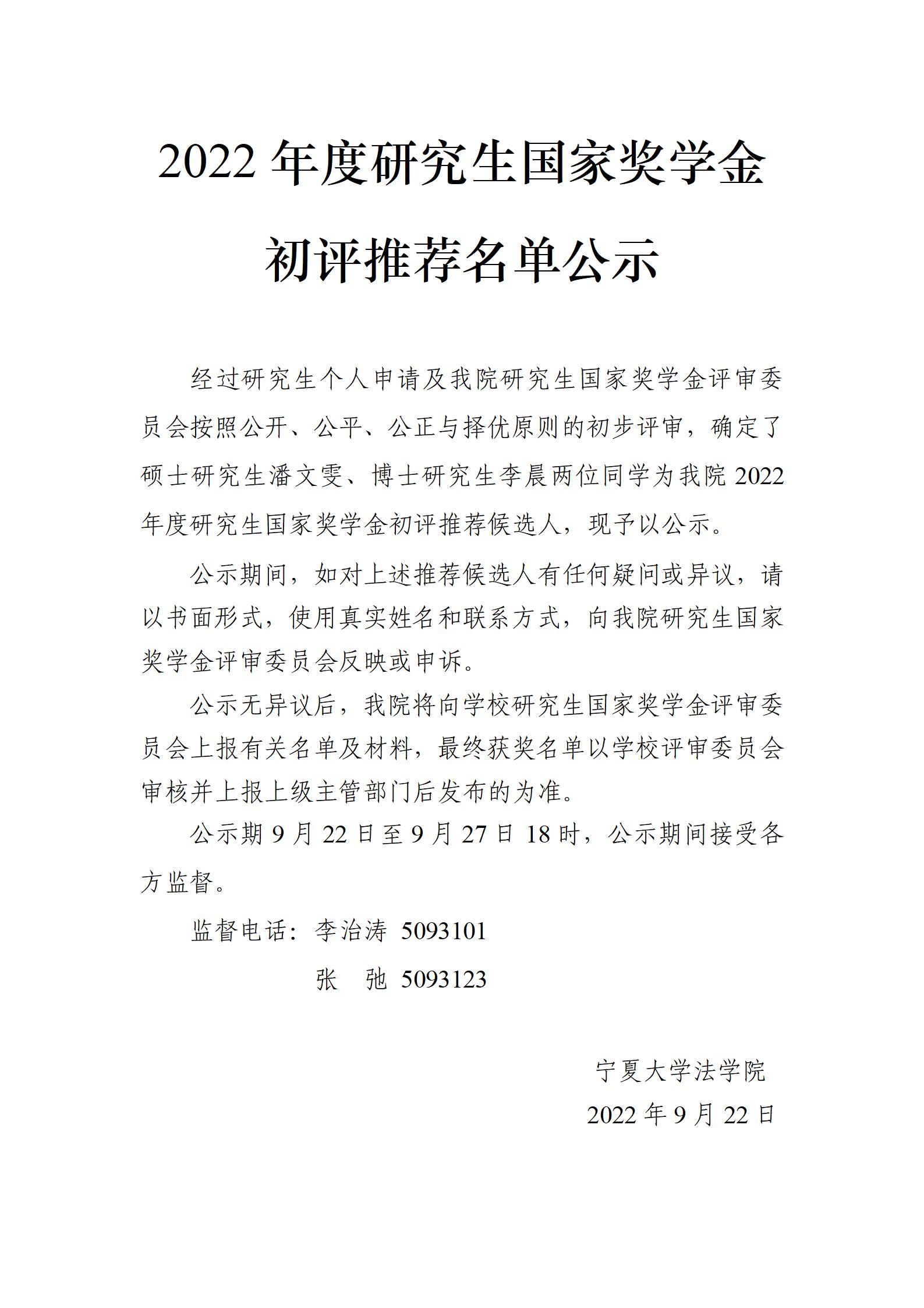 2022年度研究生国家奖学金初评推荐名单公示