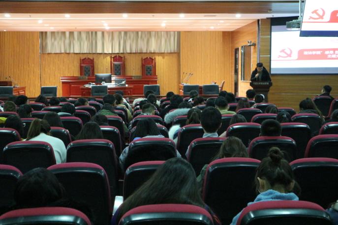 在模拟法庭组织青马班学员学习《新时代爱国主义实施纲要》,2017级学生杨有贵领学,青马班全体学员参加学习。