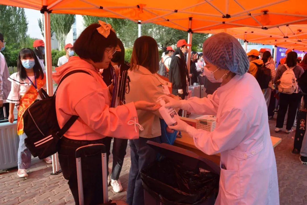 报到注册点。现场摆放着醒目的报到流程示意图,提醒新生有秩序地完成注册手续。注册点志愿者们分工详细,依次进行着信息登记、入学资格初查、发放入学材料等工作。其他志愿者负责新生的行李转运和宿舍引导工作,在今年受疫情影响、家长无法入校的特殊情况下,妥善处理好新生的行李运送问题,让新生获得便捷省心的开学初体验。
