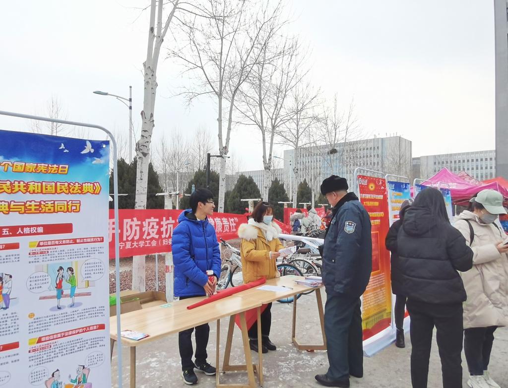 “治国凭圭臬,安邦靠准绳。”为迎接我国第七个国家宪法日的到来,引导同学们更加深入地学习和宣传习近平法治思想,大力弘扬宪法精神,宁夏大学法学社于12月2日在兰馨苑餐厅东门口举行宪法日主题宣传活动。