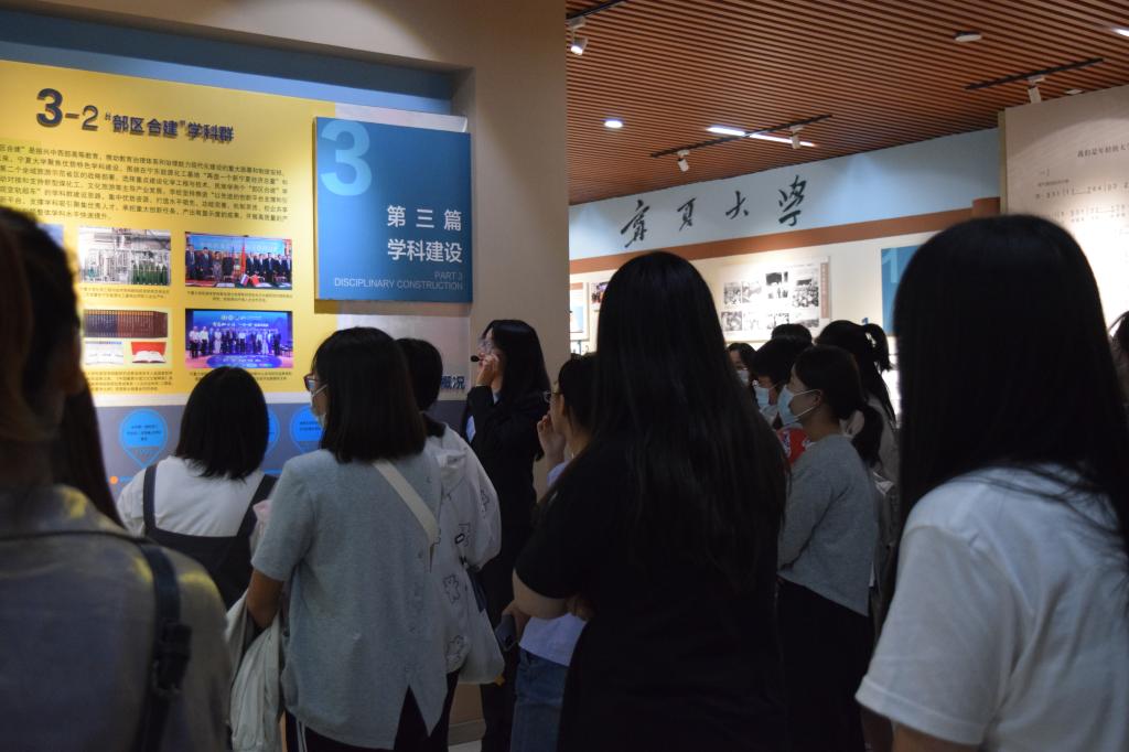 活动中,讲解员对宁夏大学的发展历史、校徽、校训、“沙枣树精神”以及学校的重大发展成果等领域进行详细讲解。一张张老照片叙述着宁大的往昔,一份份新成就彰显着宁大的生机,这一切都与一代代宁大人的共同努力和团结奋斗分不开。