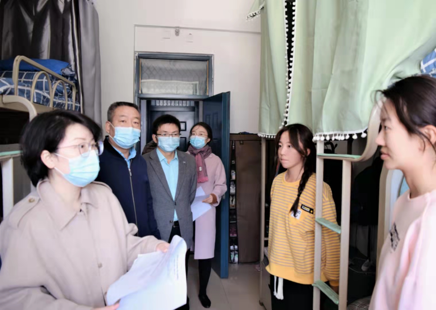 领导走进宿舍与学生们进行了亲切的交谈,详细询问了疫情期间学生们的思想动态,以及在生活和学习上遇到的困难和问题。叮嘱大家按时参加线上课程、注意寝室卫生、做好个人防护,鼓励学生之间要相互理解、相互包容,努力营造一个安全、卫生、文明、和谐的宿舍环境。希望同学们充分利用有限的学习时间,提升自身的专业知识水平,为将来的实习和就业打下坚实的基础。