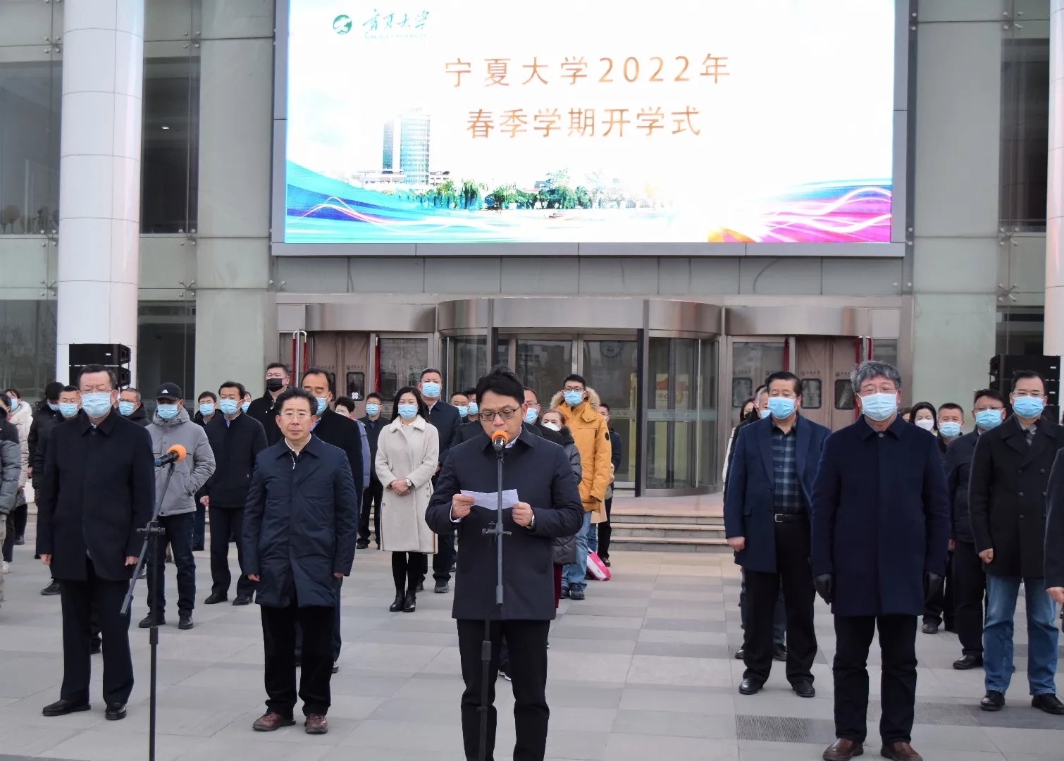 2月28日清晨,宁夏大学2021-2022学年春季学期升旗仪式于贺兰山校区德勤楼前举行,仪式由校党委副书记、校长彭志科主持,全体校领导及部分学生代表到场参加。