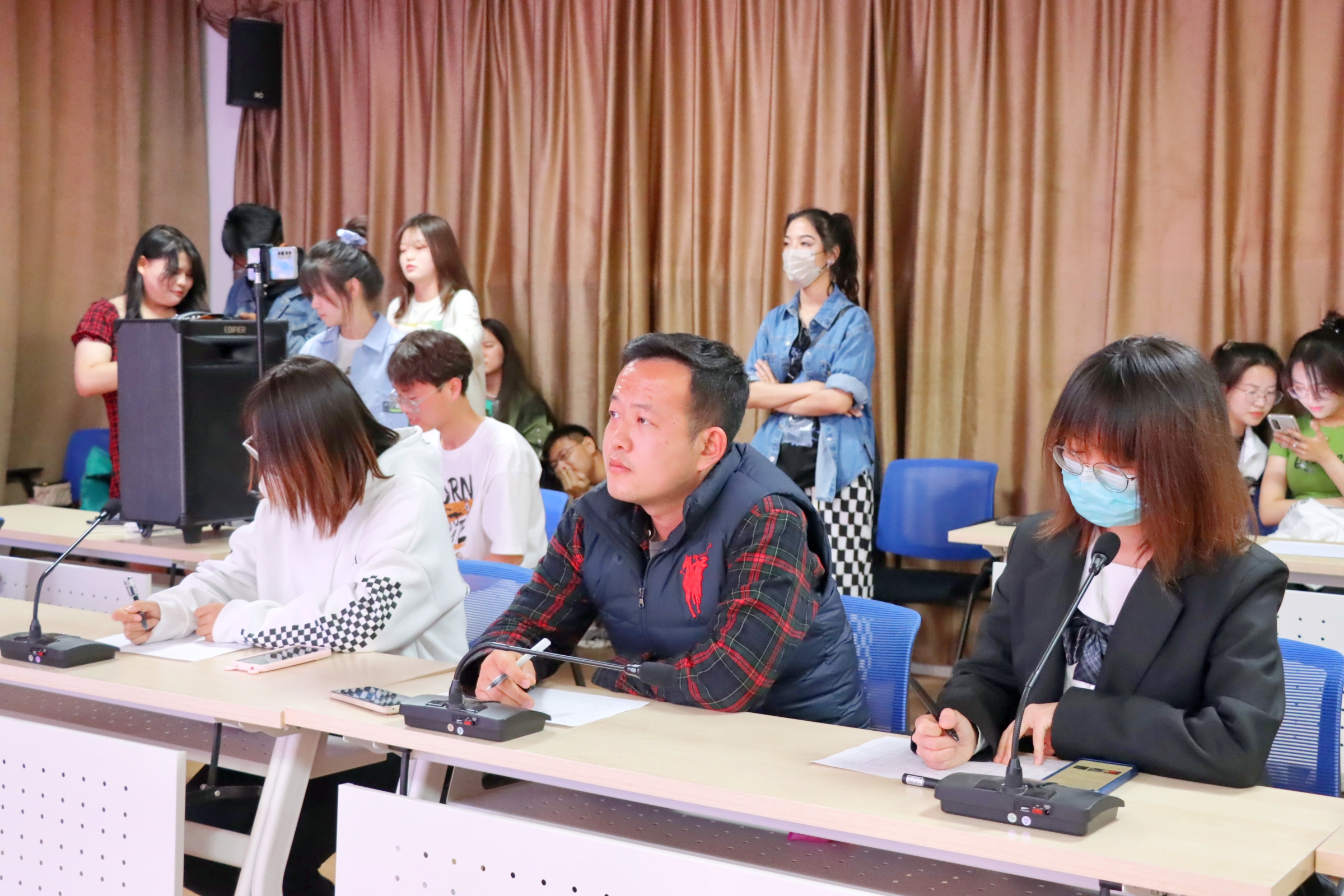 “卡拉OK大赛”决赛于文萃校区法治基地举办,院党委书记李治涛、院长吕耀军、副书记杨扬、团委书记王嘉豫、法律系教工党支部书记张弛、辅导员付晓晨分别在线上线下出席并参与活动。决赛采用抖音直播和腾讯会议互动相结合的形式进行,经过前期初赛选拔,共有十组歌手脱颖而出,来到决赛的赛场。
