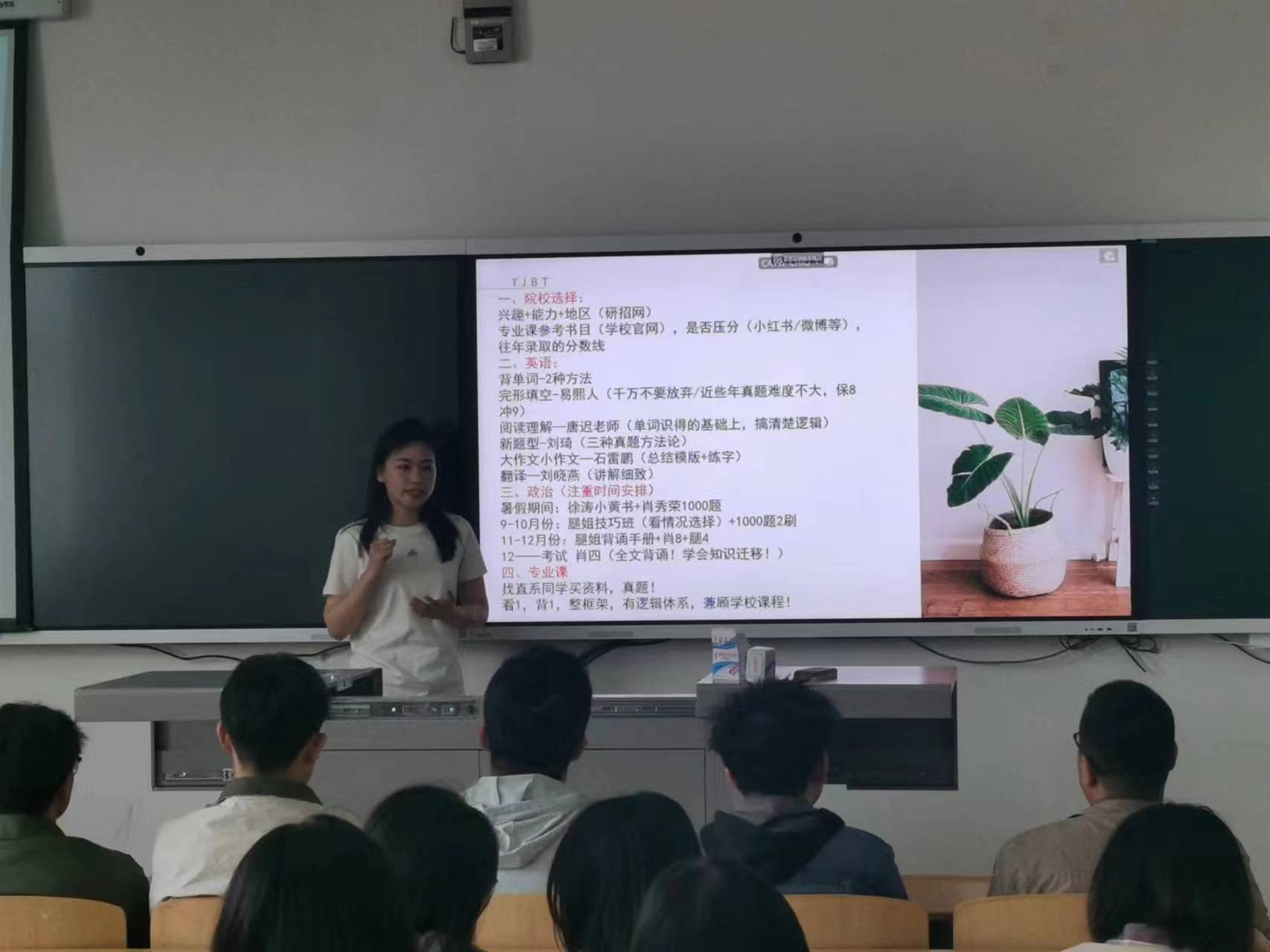 第二位经验分享人是2019级行政管理专业的贾芊同学,贾芊在2022年研究生考试中以优异成绩被上海师范大学录取。分享会上,贾芊就同学们关注的院校选择、时间规划、公共课与专业课复习思路进行了讲解,贾芊特别分享了自己的外语学习方法和网络优质考研博主,并提示同学们在做题的过程要学会知识迁移与知识点之间的逻辑。最后,贾芊分享了自己的考研十六字真经:调整心态、劳逸结合、按部就班、脚踏实地,希望同学们能够不骄不躁,顺利考取理想的院校。