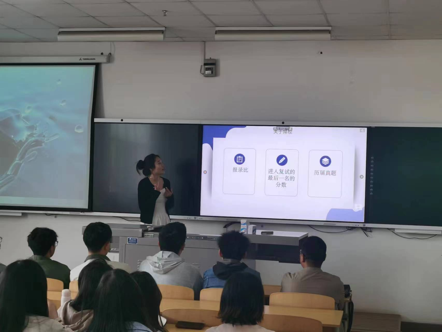 李辰老师毕业于新加坡SIM/莱佛士大学,具有丰富的留学与职业规划申请经验。在分享会上,李老师主要就职业规划、出国留学、岗位应聘的基本流程作了讲解,并介绍了个性化职业规划方案、专业分析与出国留学之间的关系,接着向同学们阐明了留学前期准备、简历、网申、网测、面试各环节的注意事项,并就国外院校排名优势、宁夏政策优惠、出国花销性价比等方面解答了同学的疑问。