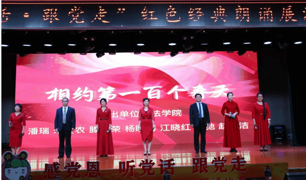 代表队于第三篇章——天耀中华压轴出场,教师们用质朴的语言,真挚的感情朗诵了作品《相约在第一百个春天里》,他们以慷慨激昂的语调,深情款款的言语,热情讴歌党的丰功伟绩和共产党人永恒的精神追求、崇高的理想信念,倾注了对党和国家的热爱与感激。现场掌声阵阵、气氛热烈。