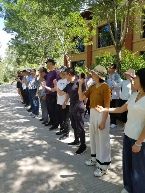 随后,教师们在西夏王玉泉国际酒庄开展拓展活动。活动在原始部落“破冰游戏”中拉开序幕。大家互相捏捏肩、拍拍背,一起完成指定的口令动作。整个过程幽默有趣,迅速营造起团队愉悦的氛围。