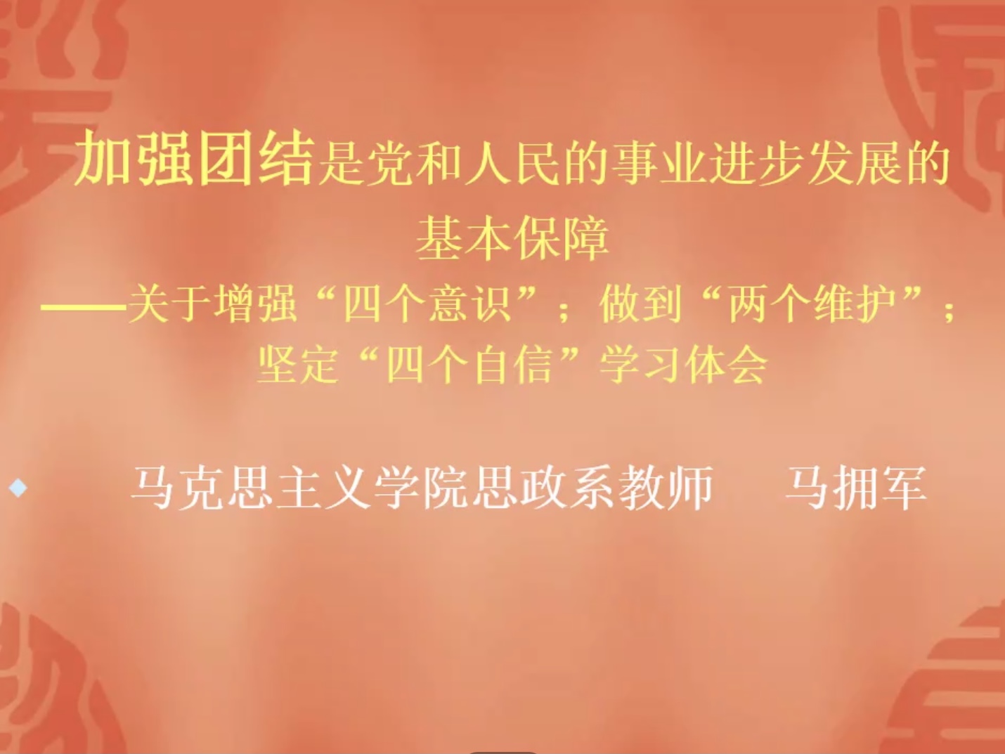 讲座中,马拥军首先带领大家学习了党的团结的基本概念,详细介绍了政党及其特征和团结的基本定义。在此基础上,马拥军向学员们阐述了中国共产党的团结对于新时代中国特色社会主义事业具有重要意义,并引用了习近平总书记在党的十九大报告中的发言,让学员们明白了维护党的团结统一有利于推动全国人民共同走向中华民族伟大复兴的光明前景。
