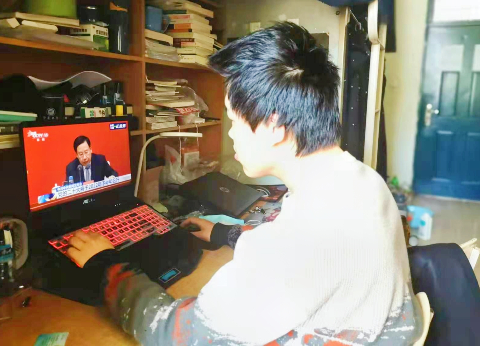 尽管当前疫情形势严峻,同学们都在宿舍里隔离,但是阻挡不了大家学习十九届六中全会精神的心,一大早同学们在宿舍里一同观看十九届六中全会直播,全面总结党的百年奋斗重大成就和历史经验,将使全党增长智慧、增进团结、增加信心、增强斗志,更加坚定、更加自觉地践行初心使命,在新时代新征程上展现新气象新作为。历史从哪里开始,思想进程也从哪里开始。作为大学生,每个同学都有义务全面提高自己的思想道德修养。