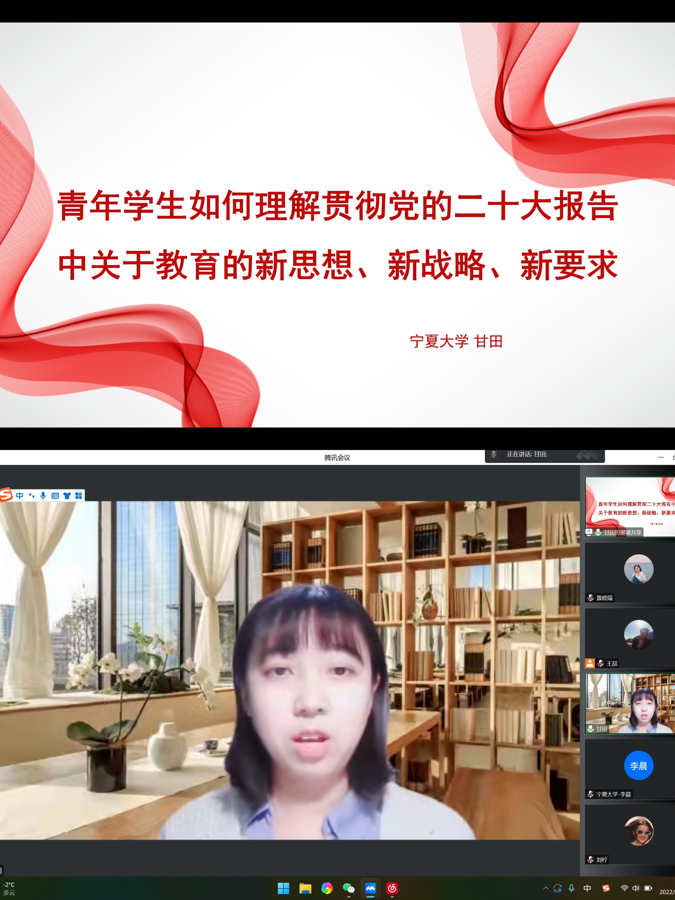 2019级民族地区公共管理专业博士研究生、现为中华民族共同体研究院博士后甘田分享的主题是《青年学生如何理解贯彻党的二十大报告中关于教育的新思想、新战略、新要求》。她说,青年学生要贯彻党的二十大报告中关于教育的新思想、新战略、新要求。第一,把握时代主题,聚焦热点、焦点,跟上时代步伐。第二,围绕一个研究领域做精、做专、做强。第三,跟紧导师研究方向,不断学习,以项目引领学习。第四,提升阅读的质和量,泛--专--精。第五,做好科研志,善用各类技术软件、数据库,使提升研究质量和效率有效。第六,端正学习态度,内化学术研究责任感。