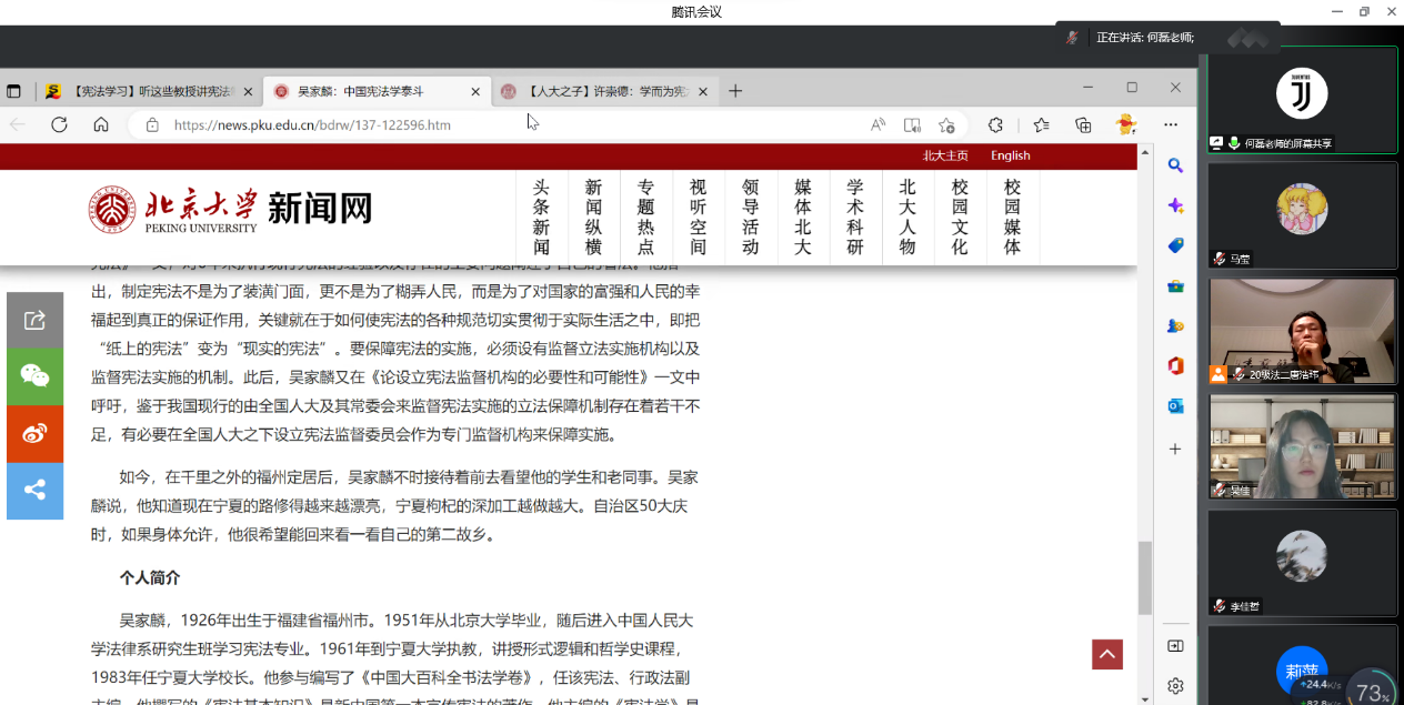 主题活动分为两个部分,第一部分活动是吴家麟老先生和许崇德老先生的学术生涯回顾。在何磊的讲述中,同学们了解到:吴家麟老先生1926年出生于福建省福州市,享年91岁。1951年从北京大学毕业,随后进入中国人民大学法律系研究生班学习宪法专业,同年,调入本校国家法教研室任教。1961年到宁夏大学执教,讲授形式逻辑和哲学史课程,1979年任宁夏大学副校长,1983年任宁夏大学校长。2012年9月被中国法学会授予“全国杰出资深法学家”称号。2015年10月被中国宪法学研究会授予“中国宪法学发展终身成就奖”。老先生在普及逻辑学方面造诣颇深,他的《故事里的逻辑》、《与中学生趣谈逻辑》让枯燥的逻辑学有了亲切的面孔。他在1954年新宪法正式颁行前出版了自己的第一部论著——《宪法基本知识讲话》,是新宪法颁布前第一本系统宣传宪法的专著,深受读者欢迎,印刷发行了90万册。1983年2月,群众出版社出版了由吴家麟老先生主编的高等玩游戏赚钱app 校法学教材《宪法学》,解决了当时各个法律院系对教材的急需。该书被许崇德誉为“破国内数十年法学研究之冰封,开日后宪法学繁茂之先河”,是1982年宪法颁布后国内发行的第一部宪法学教材。另一方面,担任宁夏大学校长期间,吴家麟凭借自己在中国法学界的声望,与邵逸夫先生多次接洽,由其出资为宁大建设了3000平方米的外语教学楼,使学校的教学条件得到很大改善。老先生作为中国宪法学界炙手可热的法学泰斗,将自己的一生奉献在了这片祖国的西部地域,他为中国法学界、宁夏大学的教育发展做出的贡献将永远被我们铭记在心。