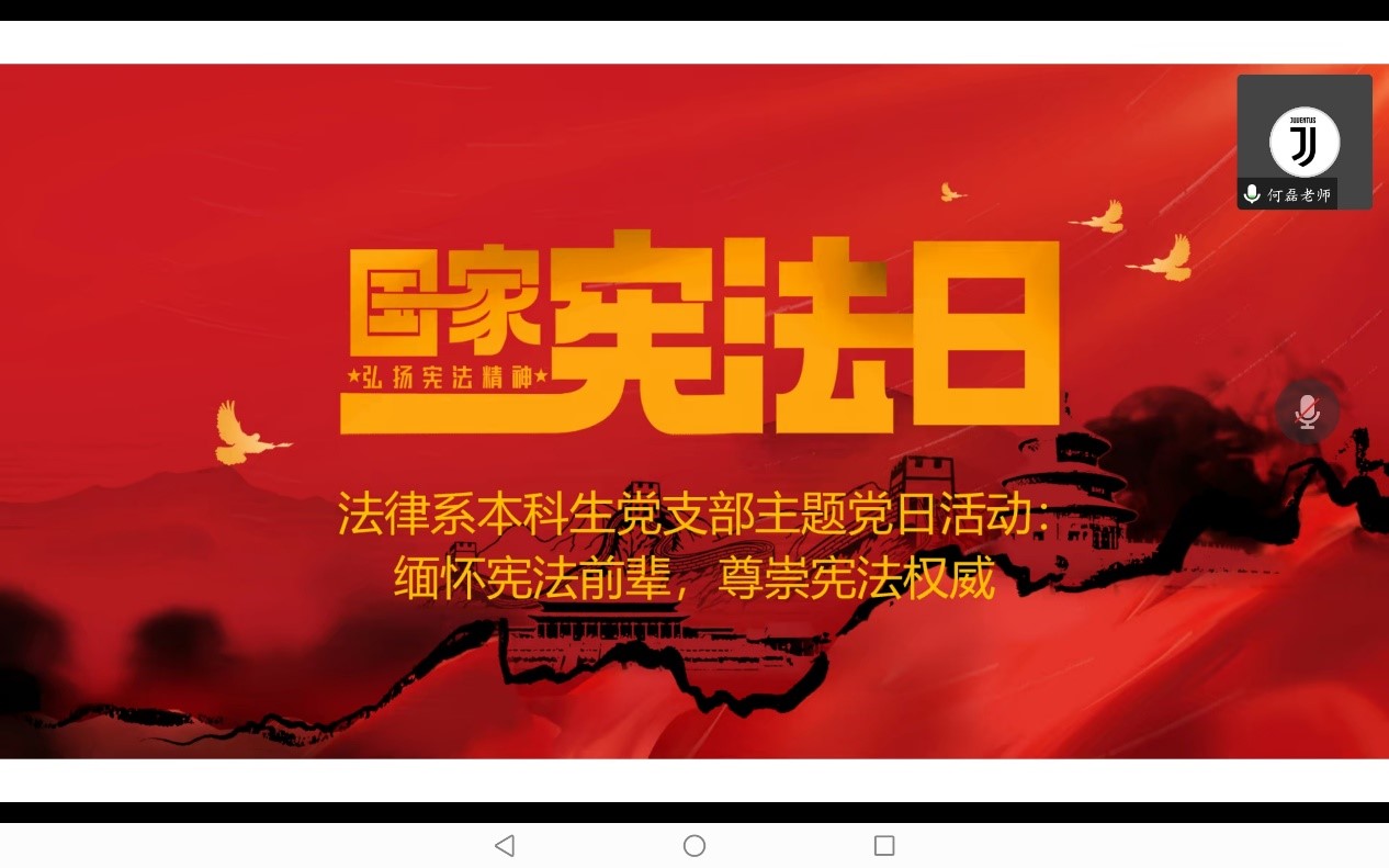 2022年12月3日,法律系本科生党支部于国家宪法日来临之际,在腾讯会议线上召开主题党日活动,会议由党支部书记何磊主持,支部全体党员同志参加。